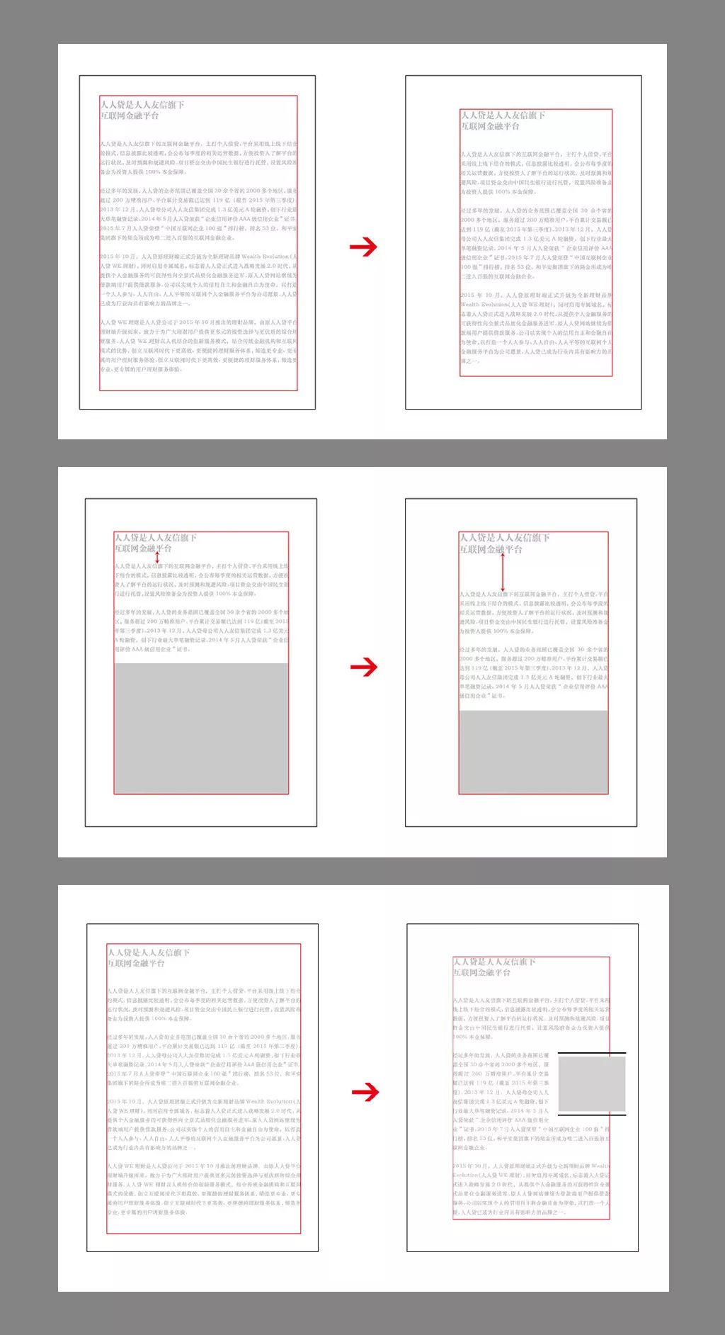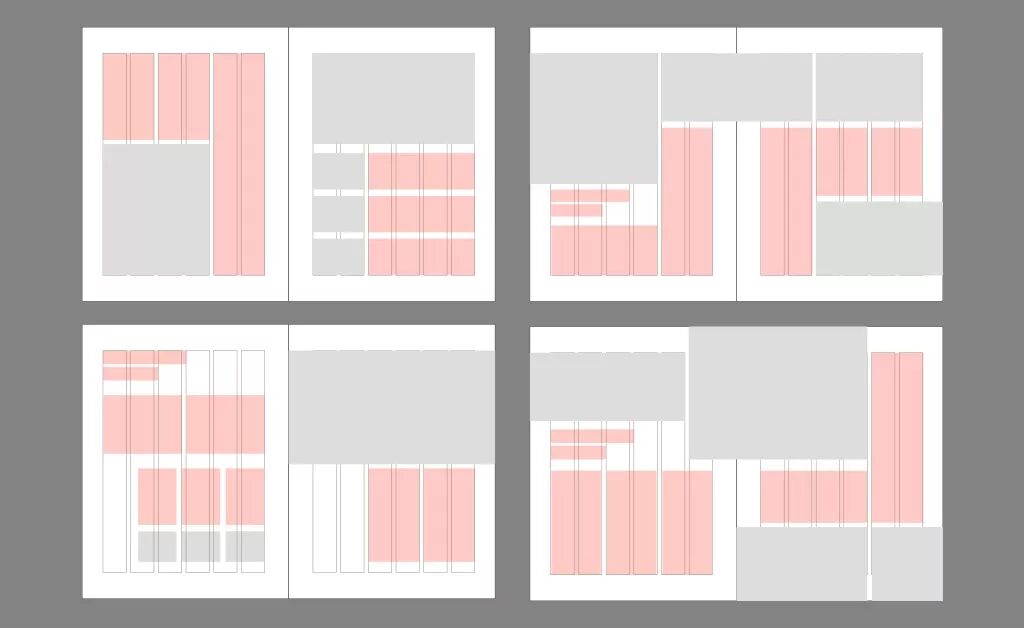 分欄是通過(guò)將整體版式垂直進(jìn)行劃分所得到的一種格式,文字內(nèi)容一般編排在分欄網(wǎng)格之中。如何處理分欄對(duì)文字的可讀性有著舉足輕重的影響。以下是針對(duì)多文字編排的版面進(jìn)行多欄網(wǎng)格的示意圖。如果是多信息的內(nèi)容編排,一般情況我都會(huì)分6欄網(wǎng)格,這樣能更好的進(jìn)行合并與拆分更靈活的網(wǎng)格。