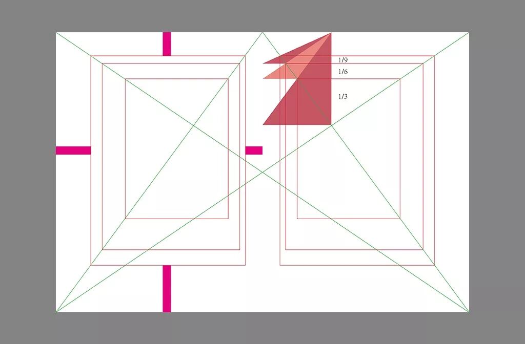 2) 你也可以選擇“維拉爾圖表法”繪制不同的版心面積,且繪制出來(lái)的這些版心區(qū)域各個(gè)邊距的比率都為2:3:4:6。(如下圖)