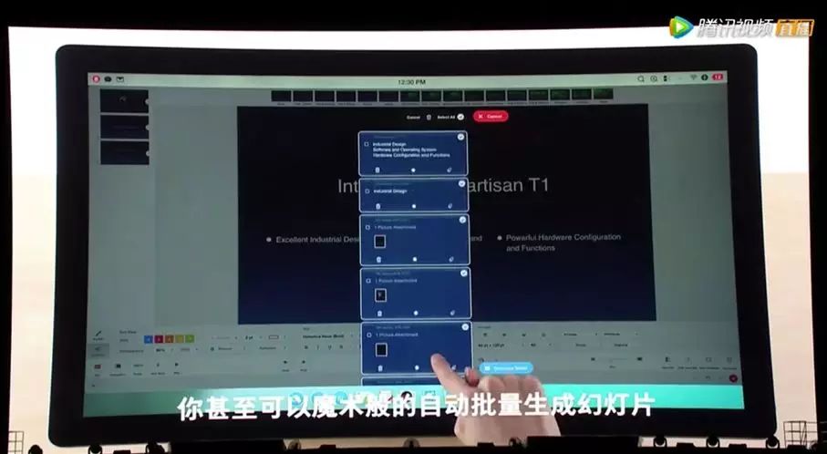 比如在 TNT 發(fā)布時,老羅為了證明它的辦公效率高,現(xiàn)場演示了 TNT 做 PPT 的場景:平時用“閃念膠囊”(一個語音助手應(yīng)用,類似 Siri)記錄了一些點子(也就是文字),做 PPT 是只需要把點子上傳給 TNT,它就可以非??斓脦椭约和瓿膳虐妗⑴鋱D、扣圖、做動畫。