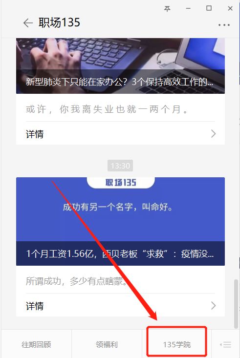 手機(jī)端:關(guān)注微信公眾號(hào)【職場(chǎng)135】,點(diǎn)擊底部菜單欄【135課堂】即可進(jìn)入。