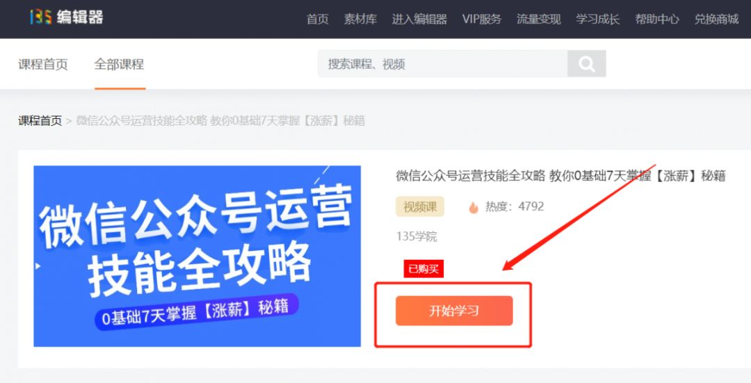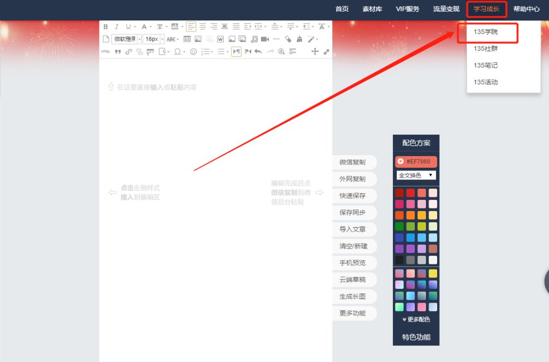 電腦端:點(diǎn)擊編輯器界面上方菜單欄【學(xué)習(xí)成長(zhǎng)】-【135課堂】,進(jìn)入學(xué)院課程界面,找到你想要學(xué)習(xí)課程的鏈接。