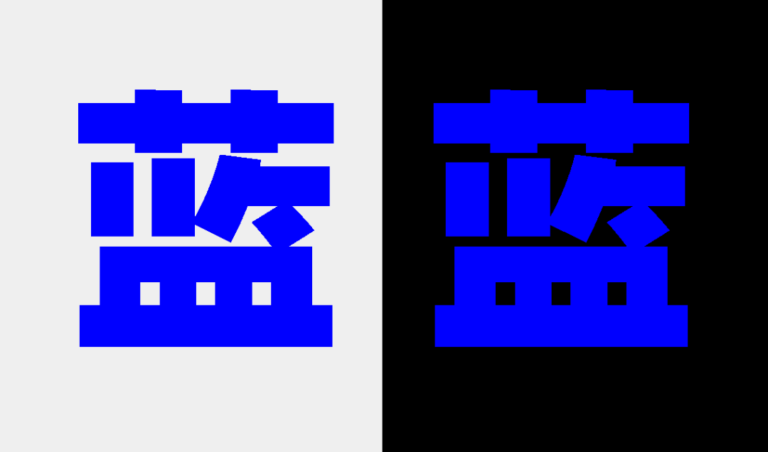 如圖,同樣的顏色在不同背景下顯示效果不同,圖中的兩個(gè)「藍(lán)」字使用的是同一種顏色RGB(0,0,255),但在不同背景下仿佛是兩種的顏色。